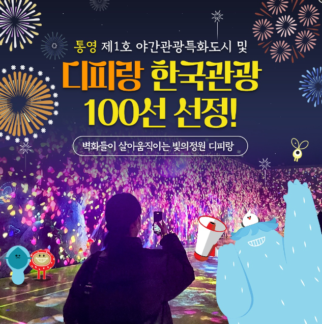 디피랑은 통영의 유명 벽화마을인 동피랑과 서피랑을 모티브로 이곳에서 사라진 벽화들이 다시 살아 움직인다는 이야기를 담은 미디어쇼를 선보이고 있습니다. 국내 최장 야간 디지털 테마파크로 남망산공원에 자리하고 1.3km의 산책로로 다양한 테마로 구성되어 있습니다. 빛과 인공조명을 활용해 아름다운 야간 경관을 즐기실 수 있습니다. 아이들과 동행할 경우 매표소에서 판매하는 라이트 볼을 구매하여 입장하면 더 재밌는 체험이 가능합니다.