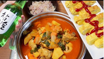 매콤하면서도 감칠맛이 나는 닭볶음탕도 겨울철 소주와 잘 어울립니다. 국물이 진한 매콤함을 더해주면서 소주와의 궁합이 좋아서, 따뜻하게 먹기 좋습니다. 다 먹고 나서 밥과 김을 볶아주면 식사까지 끝입니다.