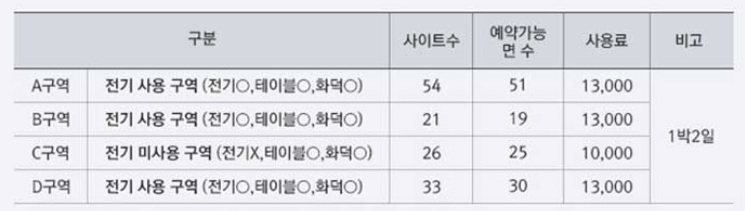 - 인터넷으로만 예약 가능(당일 잔여사이트는 현장에서 예약 가능)