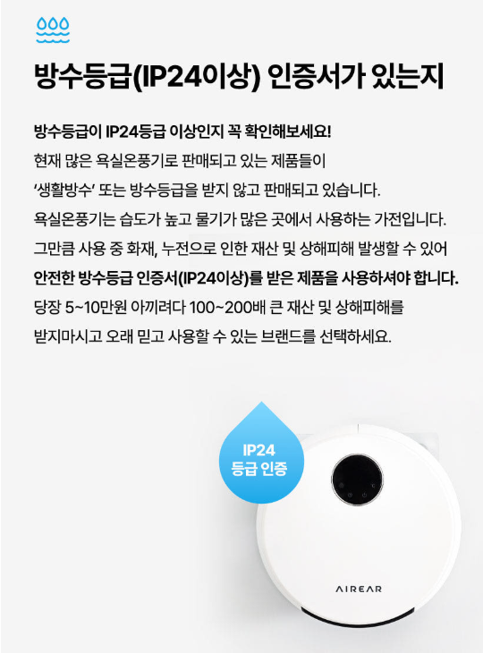 - 욕실은 습기가 많은 환경이므로, IPX4 이상의 방수 등급을 가진 제품이 안전합니다. IP 등급은 물과 먼지에 대한 보호 수준을 나타내며, IPX4 이상의 제품은 물방울로 인한 손상을 방지할 수 있습니다. 생활방수라는 문구에 낚이지 않으셨으면 합니다. 생활방수는 정해진 기준이 없습니다.