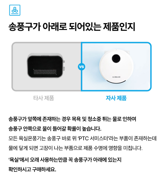 - 송풍구가 앞으로 되어있으면 물방울과 습기에 노출되어 고장이 잦을 수 있습니다. 화재, 감전까지 걱정됩니다. 송풍구의 방향이 아래로 설치되어야 안심하고 사용하실 수 있습니다.