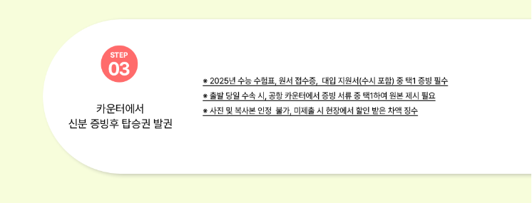 3. 공항 수속 시에 수속카운터에 증빙서류(대입 지원서, 원서 접수증, 수능 수험표) 제시하세요.