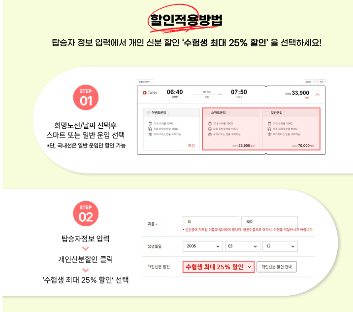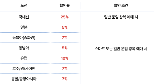- 할인율: 국내선은 왕복예매 시 25% 할인, 국제선 왕복 예매 시 10% 할인