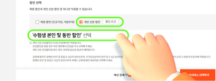 2. 개인 신분 할인에서 수험생 본인 동반자 할인 선택하세요