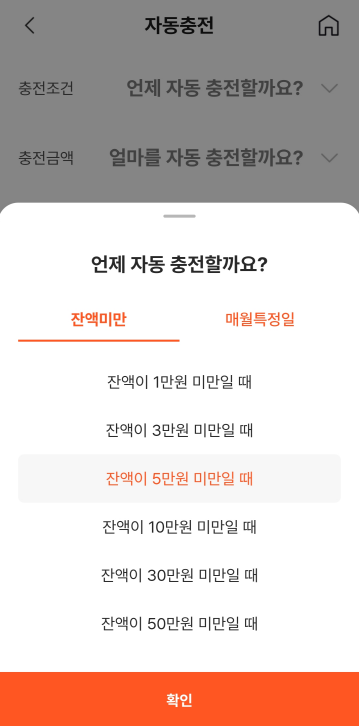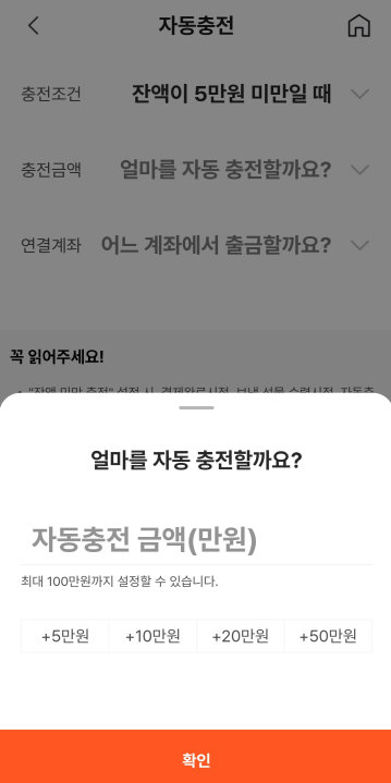 3. 계좌등록이 되었다면 충전을 해볼게요. 저는 잔액을 일정 금액 이상으로 유지하려고 자동충전을 설정했어요. 충전조건은 "잔액이 5만 원 미만일 때" , 충전금액은 10만 원. 즉 잔액이 5만 원이 안되면 10만 원씩 즉시 충전시켜 주는 거죠.