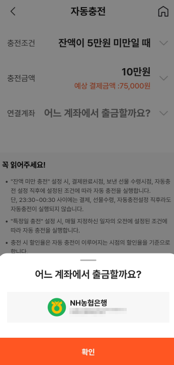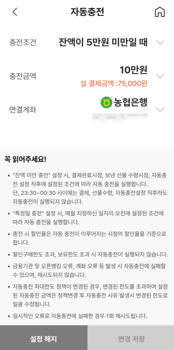 - 유의할 점은 23:30 ~ 00:30 사이에는 결제, 선물수령, 자동충전설정 직후라도 자동충전이 실행되지 않아요.
