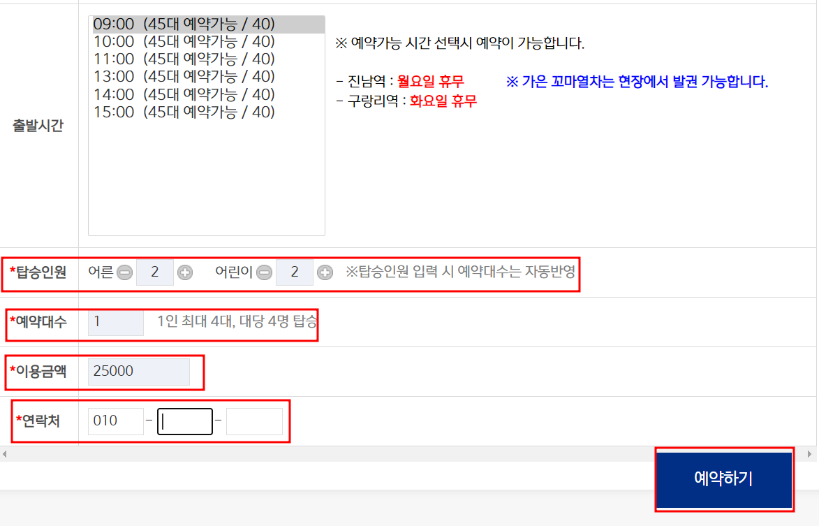 - 당일은 예약 조회만 가능, 예약 후 탑승 역 및 시간변경은 1회에 한해 변경 가능