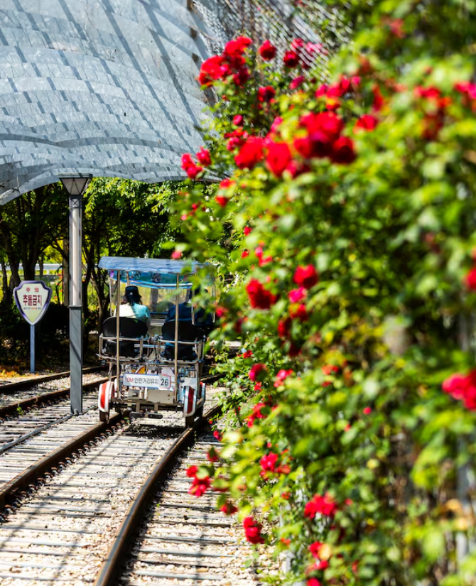 철로 자전거에 타 왕복 6.6km를 천천히 즐기다 보면 드라마 백홍 커플이 앉아 대화를 나눈 배경이 눈에 담깁니다. 장미가 만발한 장미터널~ 소박한 담벼락 벽화 등 소박한 정취를 즐길 수 있습니다. 큰 힘 들이지 않아도 돼 고생스럽지도 않아요.