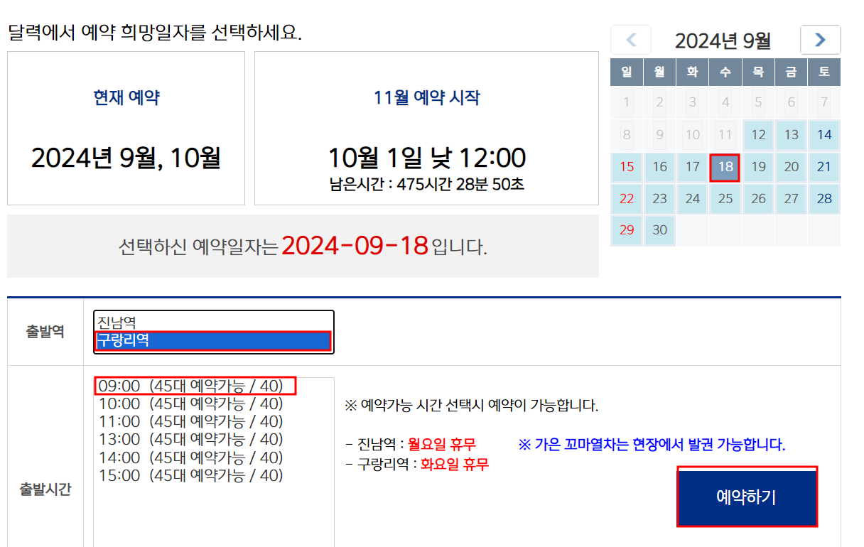 - 예약은 월의 1개월 전 1일 낮 12:00부터 시행