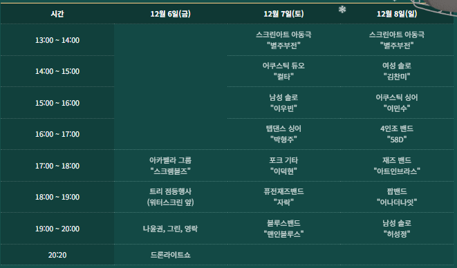 - 크리스마스 마켓: 30여 개 부스운영/ 와인, 리스, 캔들, 오너먼트 등/ 두드림공연장 앞