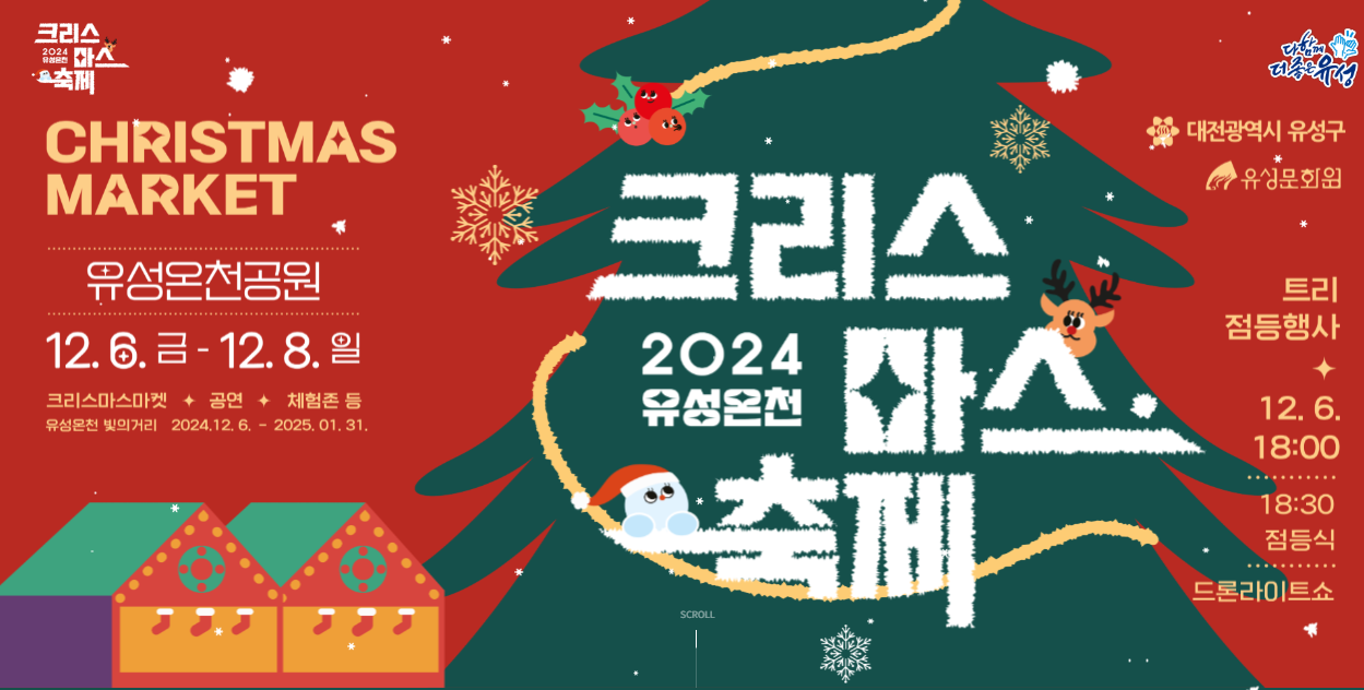 이제 곧 크리스마스가 다가오네요. 멀리 가고 싶지는 않지만 아이에게 반짝반짝한 예쁜 트리는 보여드리고 싶어 찾아봤어요. 대전 유성온천공원에서 12. 6.(금) ~ 12. 8.(일) 크리스마스 축제가 있네요. 크리스마스트리 점등식부터 드론라이트쇼까지 공유합니다.